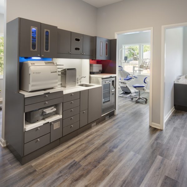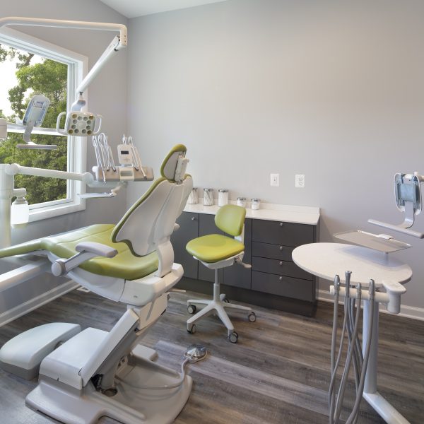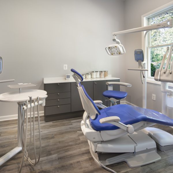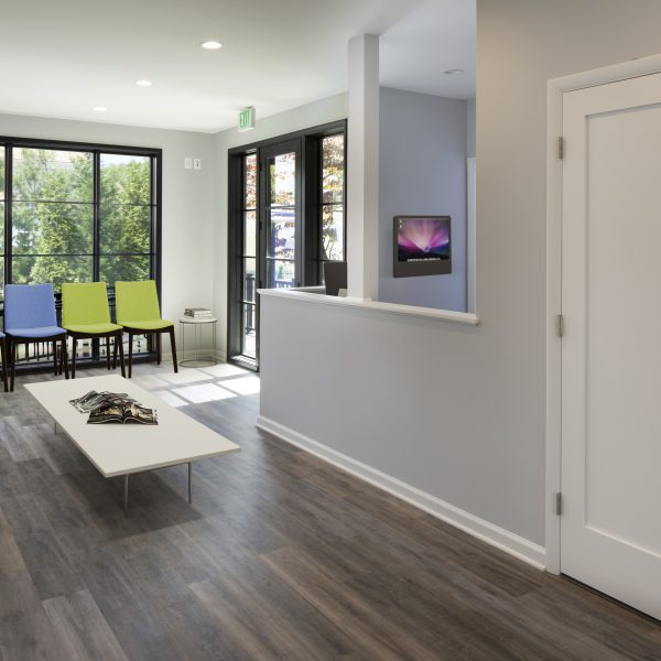 We designed and built an addition and renovation to this home that was already being used as a dentist office. The house was in a historic district, so the addition required approval from the historic review board. The bright and airy new office has large windows and glass doors on both sides of the addition that leads to a reception area. There is also a new basement under the addition for use by the staff.