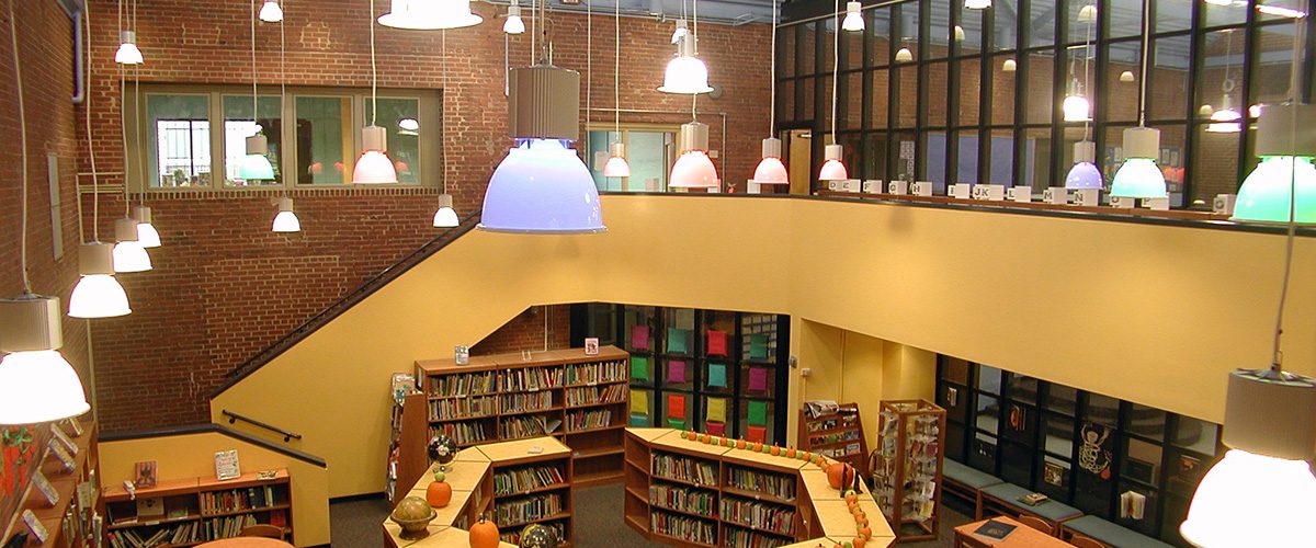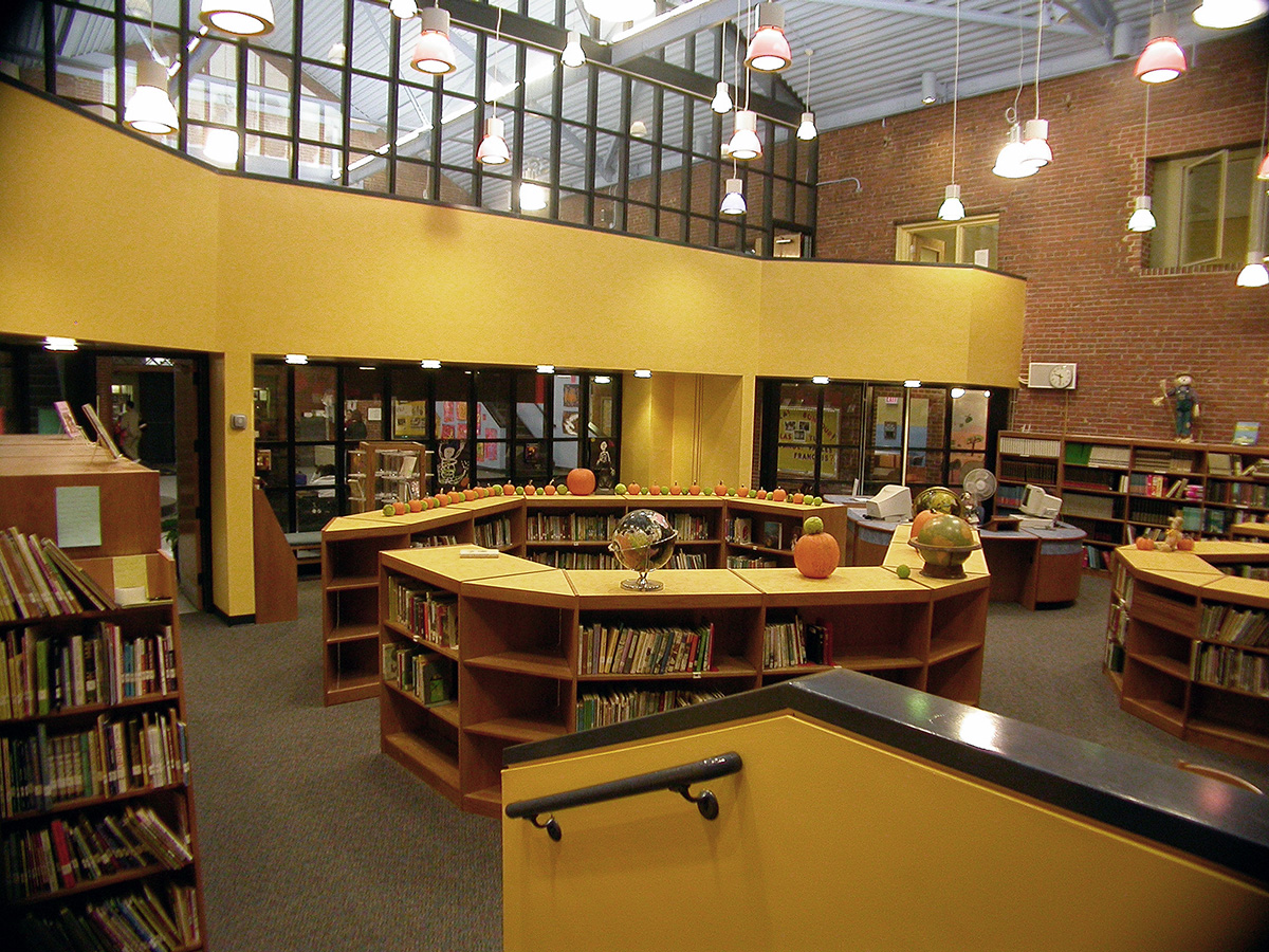 First we separated the two upper rooms acoustically from the main library by installing windows and doors in the openings. In the early readers room we opened up the room by removing an old dumbwaiter & trash chute. In the main library the use of furniture pods creates an intimate scale for students to stop and read. A periodical rack contains popular magazines. A new check out desk is positioned at the main entrance. Under the stair to the second floor an area for the librarian is framed with bookcases. The general & task lighting are chosen for their playful look as well and the lumens per sq. ft. In both of the upper rooms the existing recessed fluorescent light fixtures are lamped with warmer bulbs and parabolic egg crate diffusers.